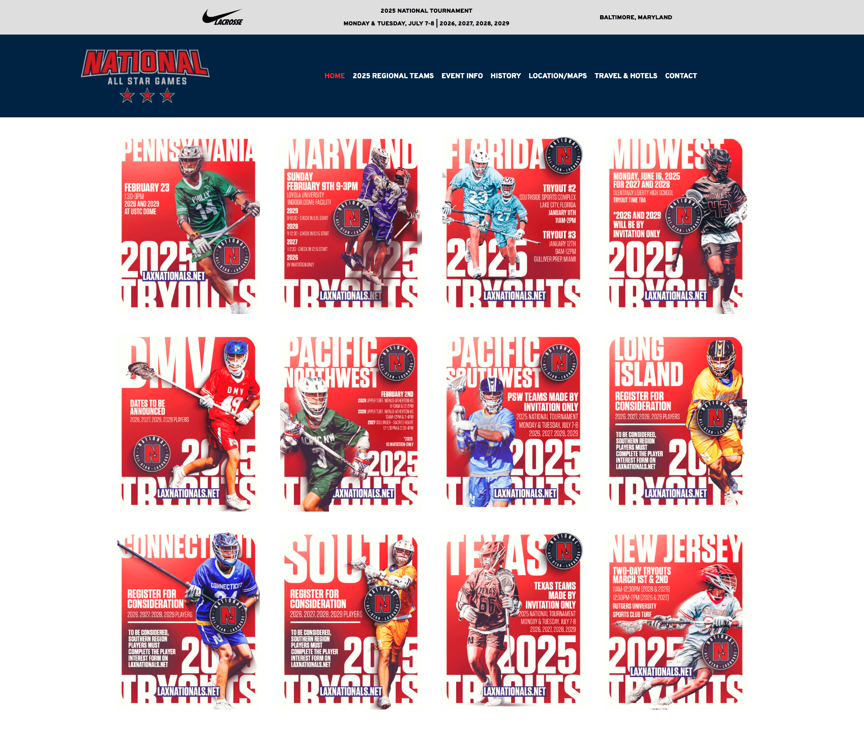 The NIKE National All Star games brings together the top high school lacrosse players from 13 regional tryouts across the United States to compete in a highly scouted tournament each summer in Baltimore, Maryland.